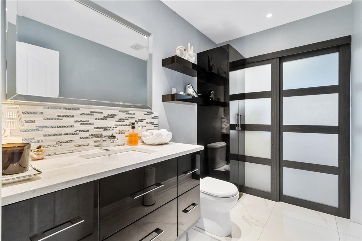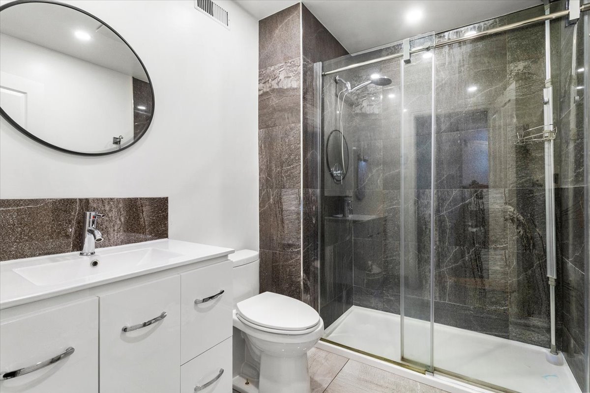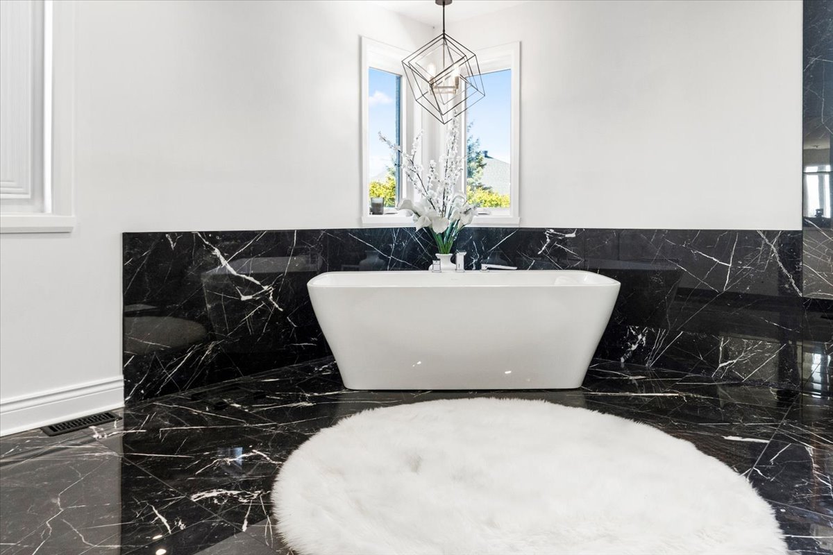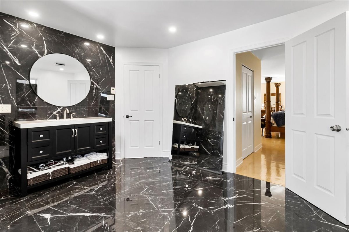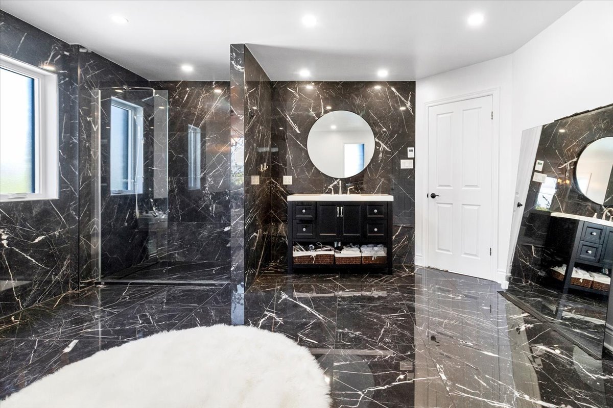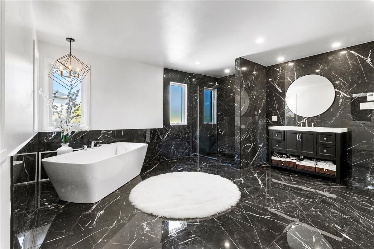 renovated bathroom. This spa-like space features a large