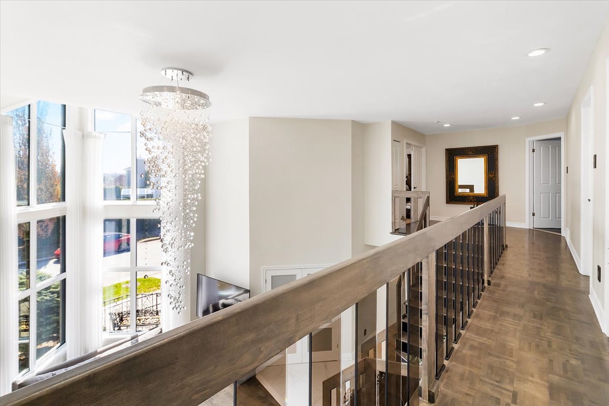 The hallway overlooking the main living area adds