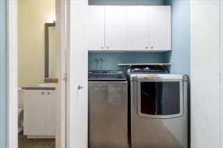 bathroom, and a powder room. Hardwood floors are located on